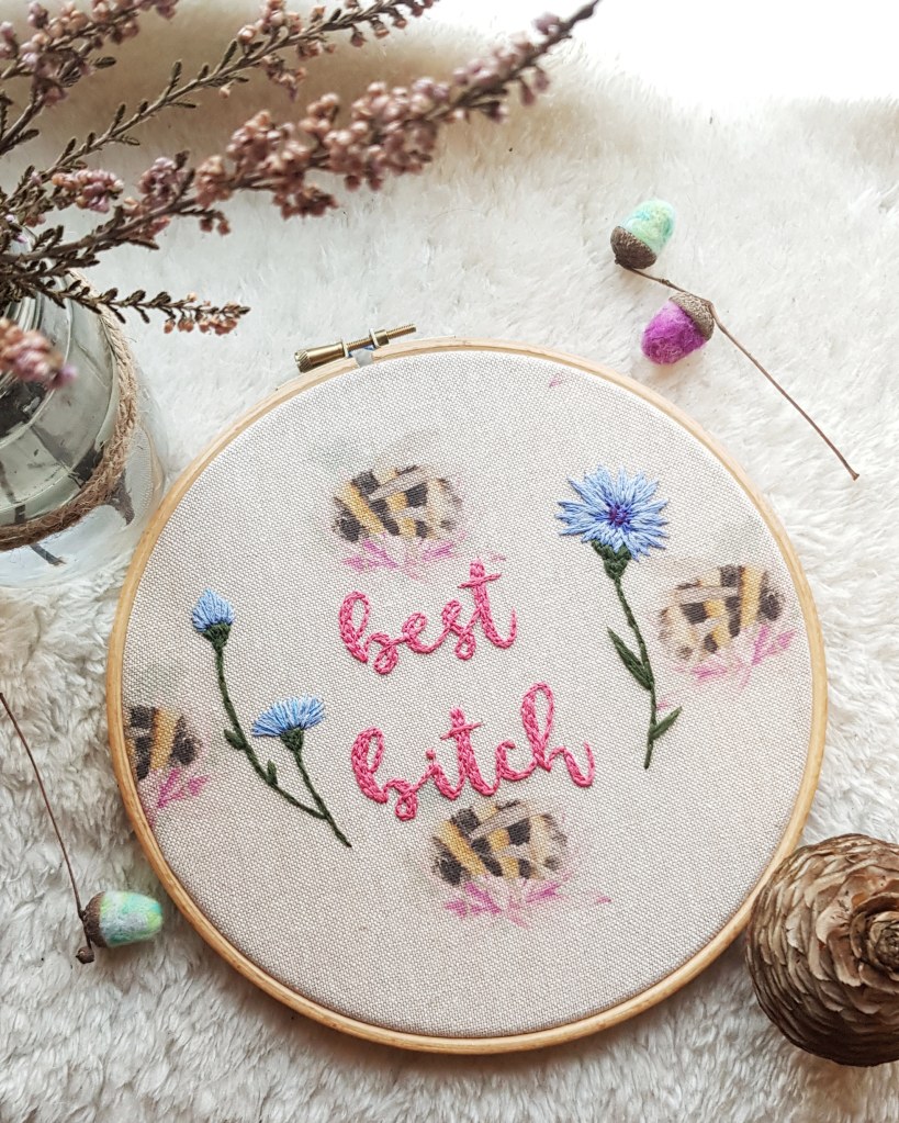 I pretty much started out buying a bundle of embroidery hoops and threads from a charity shop which was an awesome find. Getting a basic embroidery kit from Etsy with a pattern would probably be a really good place to start as it gives a really good foundation. Good, heavy duty needles are a must – I’ve had so many thinner ones snap and ouch. Not cool!